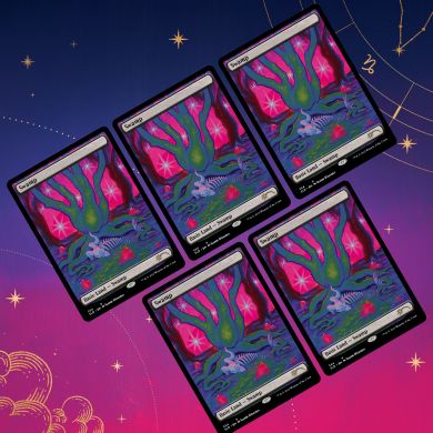 Each drop contains five copies of an awesome astrological land (Plains, Island, Swamp, Mountain or Forest) by Jeanne D’Angelo.