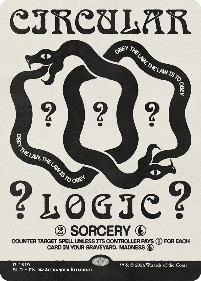 La copia de la carta Circular Logic que se encuentra en el drop "Deceptive Divination" se imprimió por error como un conjuro, aunque te aseguramos que puedes lanzarla como un instantáneo y las reglas del oracle text siguen siendo correctas. El error se encuentra tanto en la versión foil como en la versión no foil.